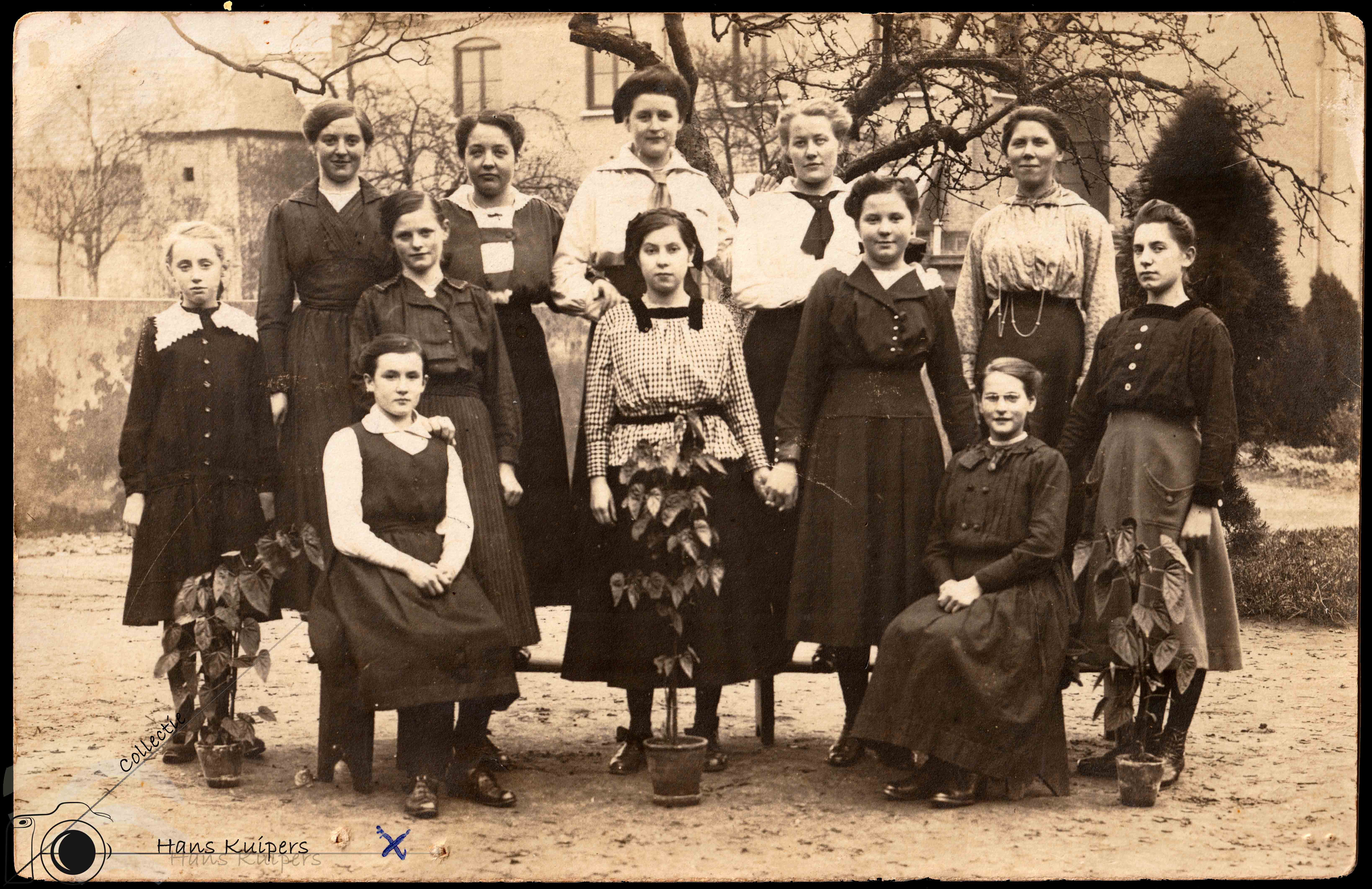 De Pensionaatkinderen poseren hier in de tuin van het st. Aloysiuspensionaat. Achterdoor is de St. Annaschool te zien.