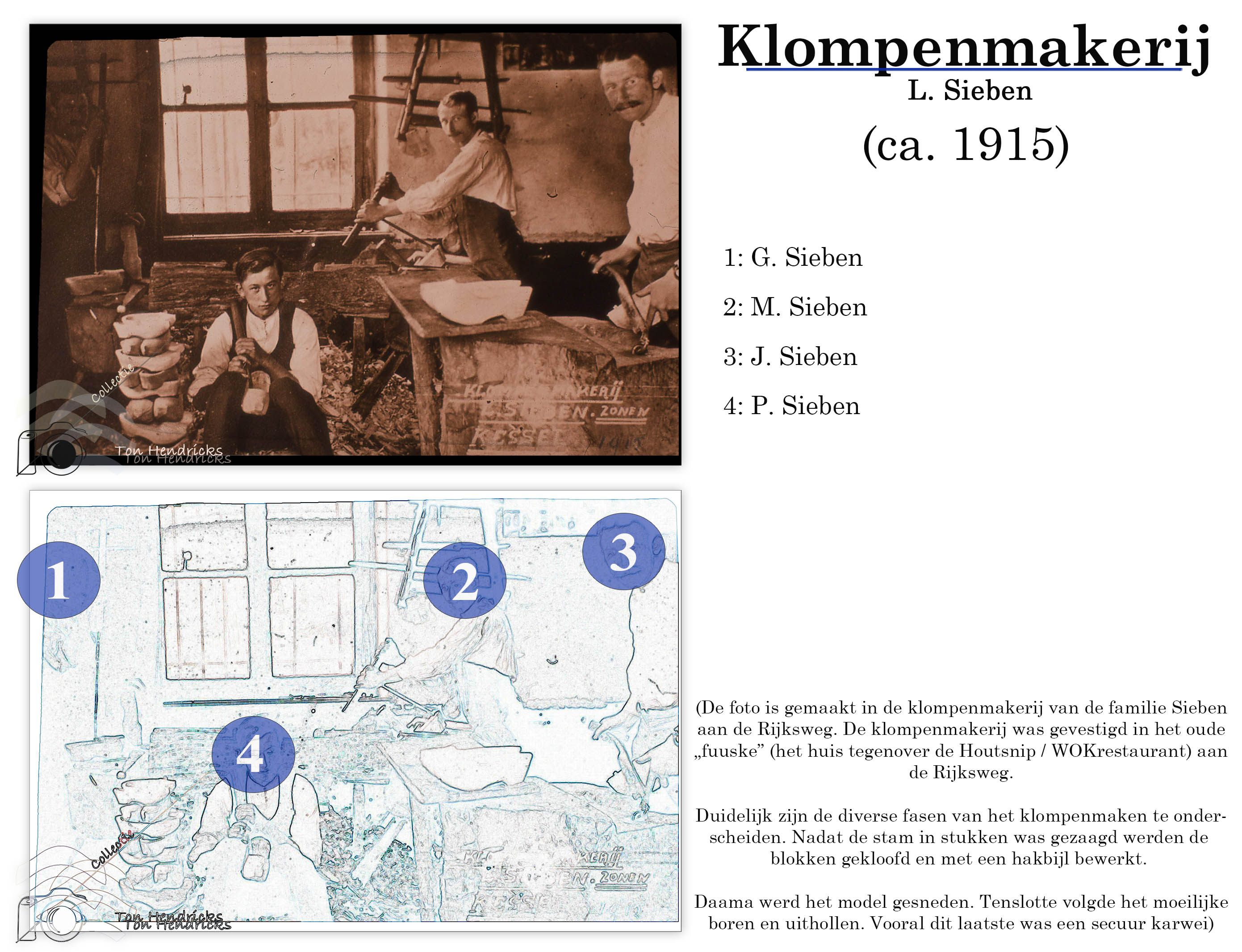 De foto is gemaakt in de klompenmakerij van de familie Sieben aan de Rijksweg. De klompenmakerij was gevestigd in het oude „fuuske” (het huis tegenover de Houtsnip / WOKrestaurant) aan de Rijksweg.
