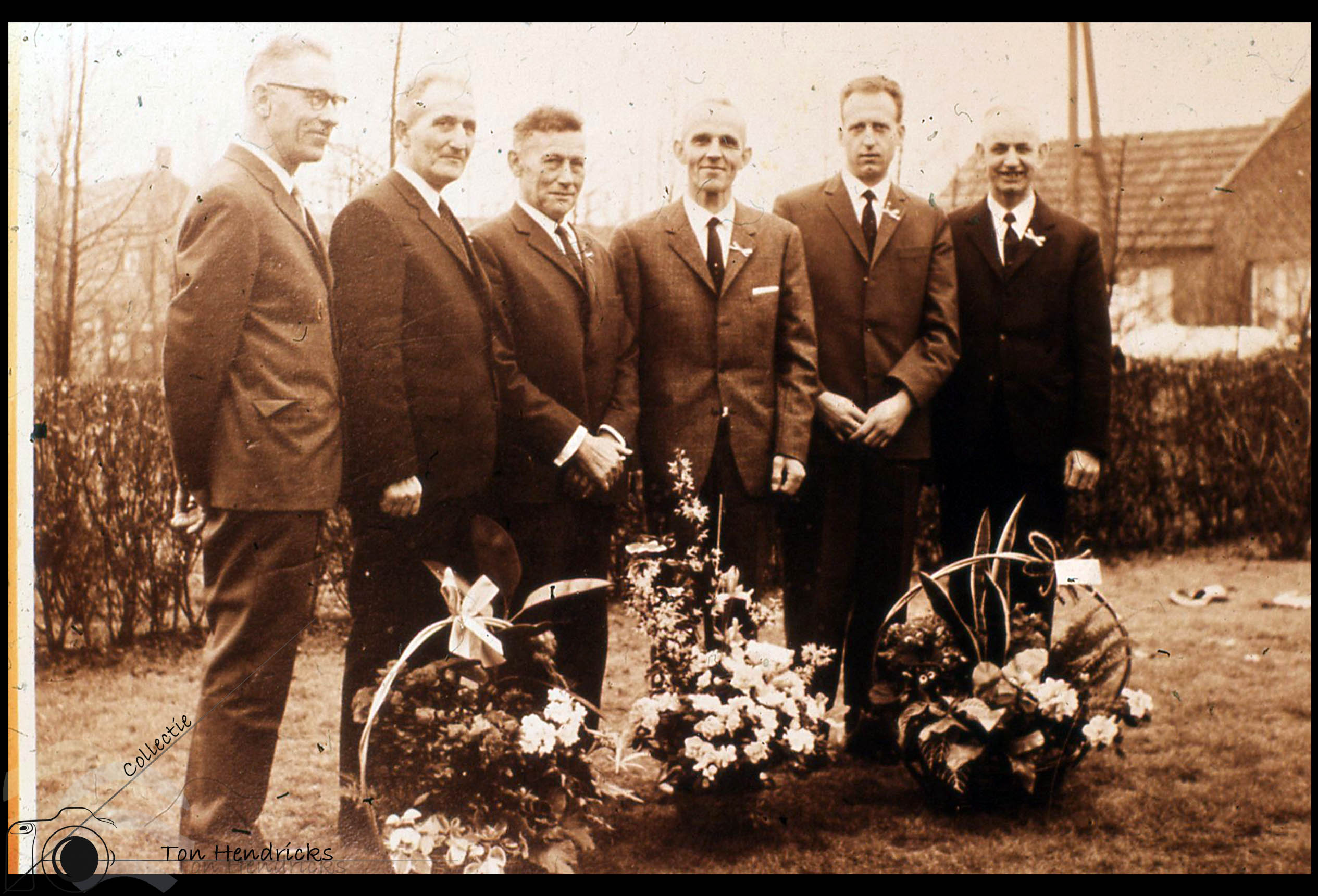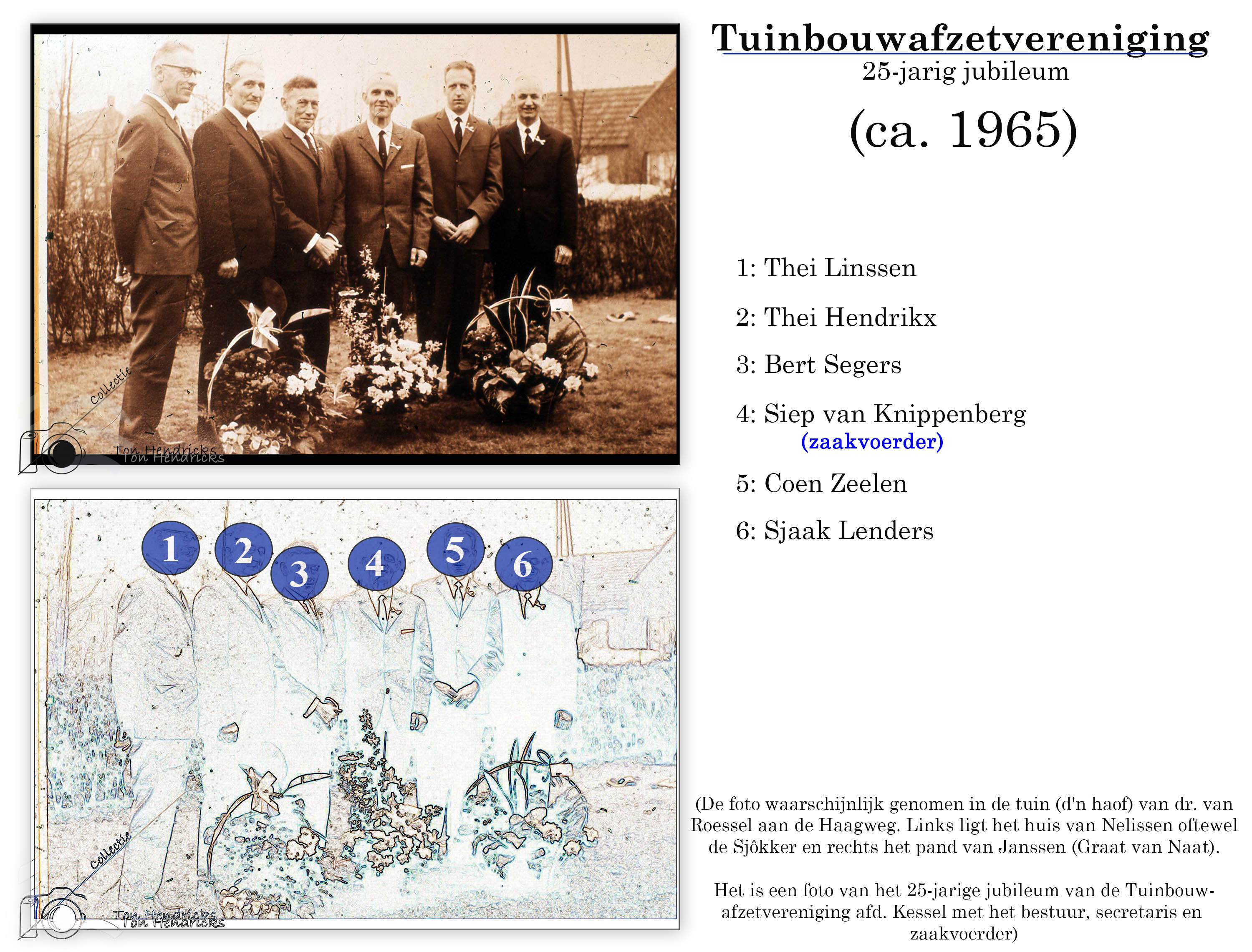 Het is een foto van het 25-jarige jubileum van de Tuinbouwafzetvereniging afd. Kessel met het bestuur, secretaris en zaakvoerder.